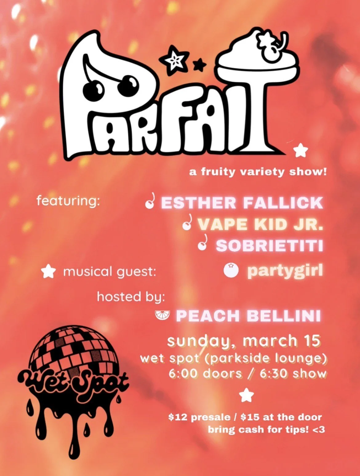 PARFAIT: A Fruity Variety Show brings together the best of queer nightlife for an unforgettable evening. Featuring comedian Esther Fallick, drag performers Vape Kid Jr. and Sobrietiti, and live music by partygirl, host Peach Bellini invites you to taste what Parfait has to offer!