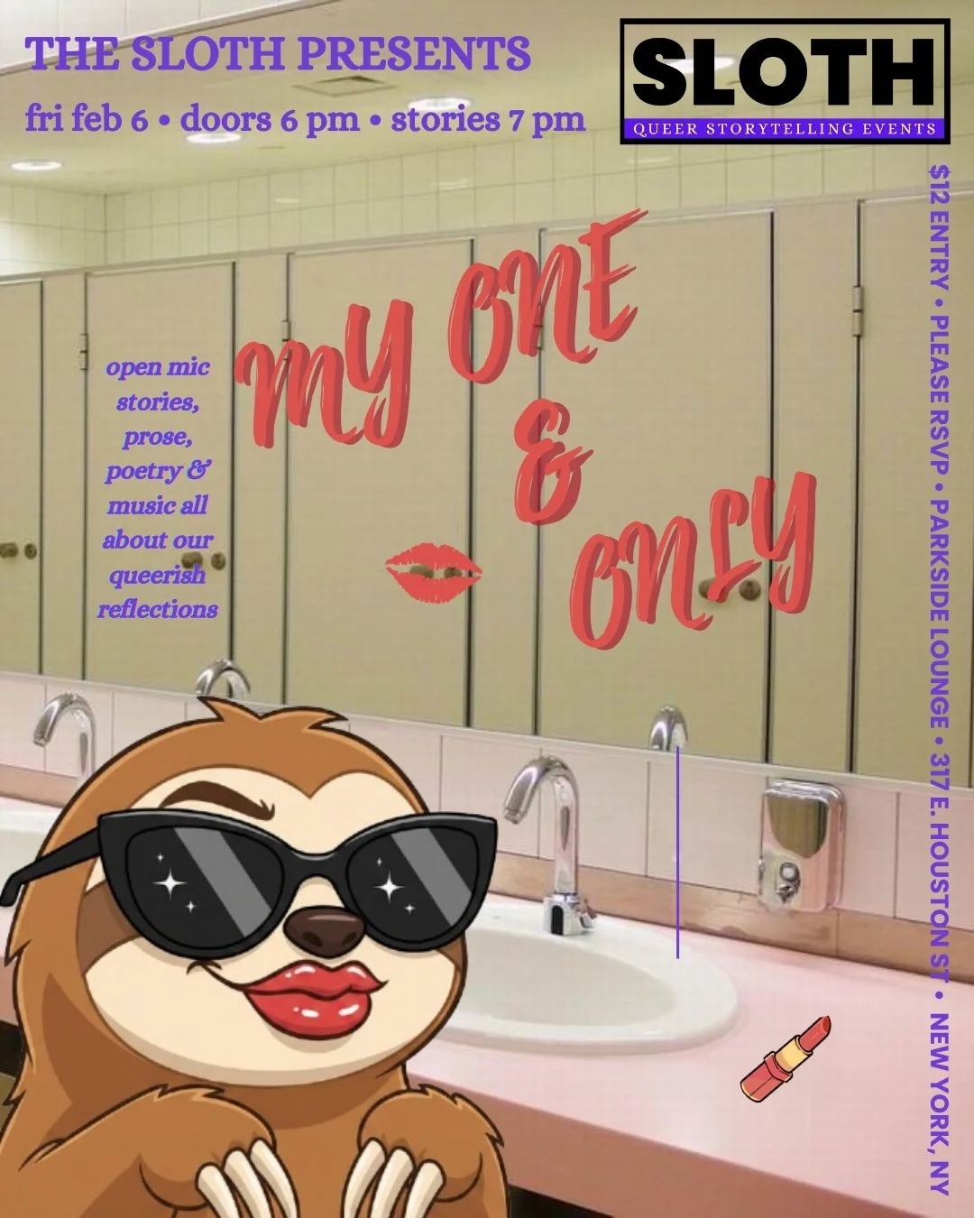 The SLOTH is our queer gathering for friends to share stories inspired by our selected themes. Come to listen or come to tell. We welcome authentic and true(ish) tales, comedy, poetry, music, and any creative form you can put into a compelling 5-minute share. Follow us @sloth.nyc