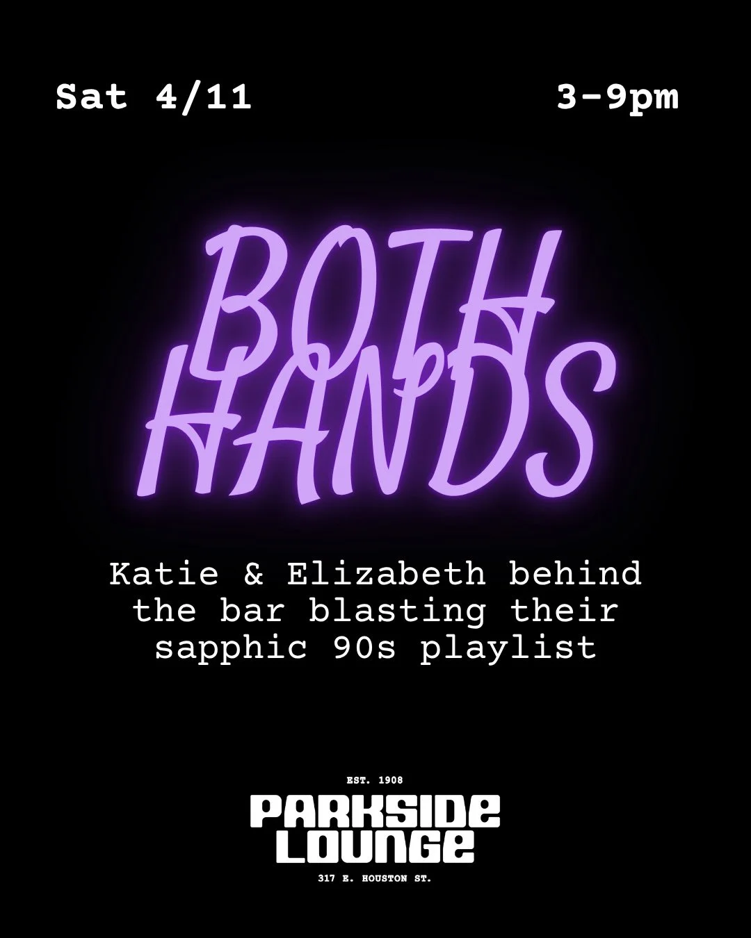 Back to All Events Both Hands Saturday, April 11, 2026 3:00 PM 9:00 PM Parkside Lounge 317 East Houston Street New York, NY, 10002 United States (map) Google Calendar ICS