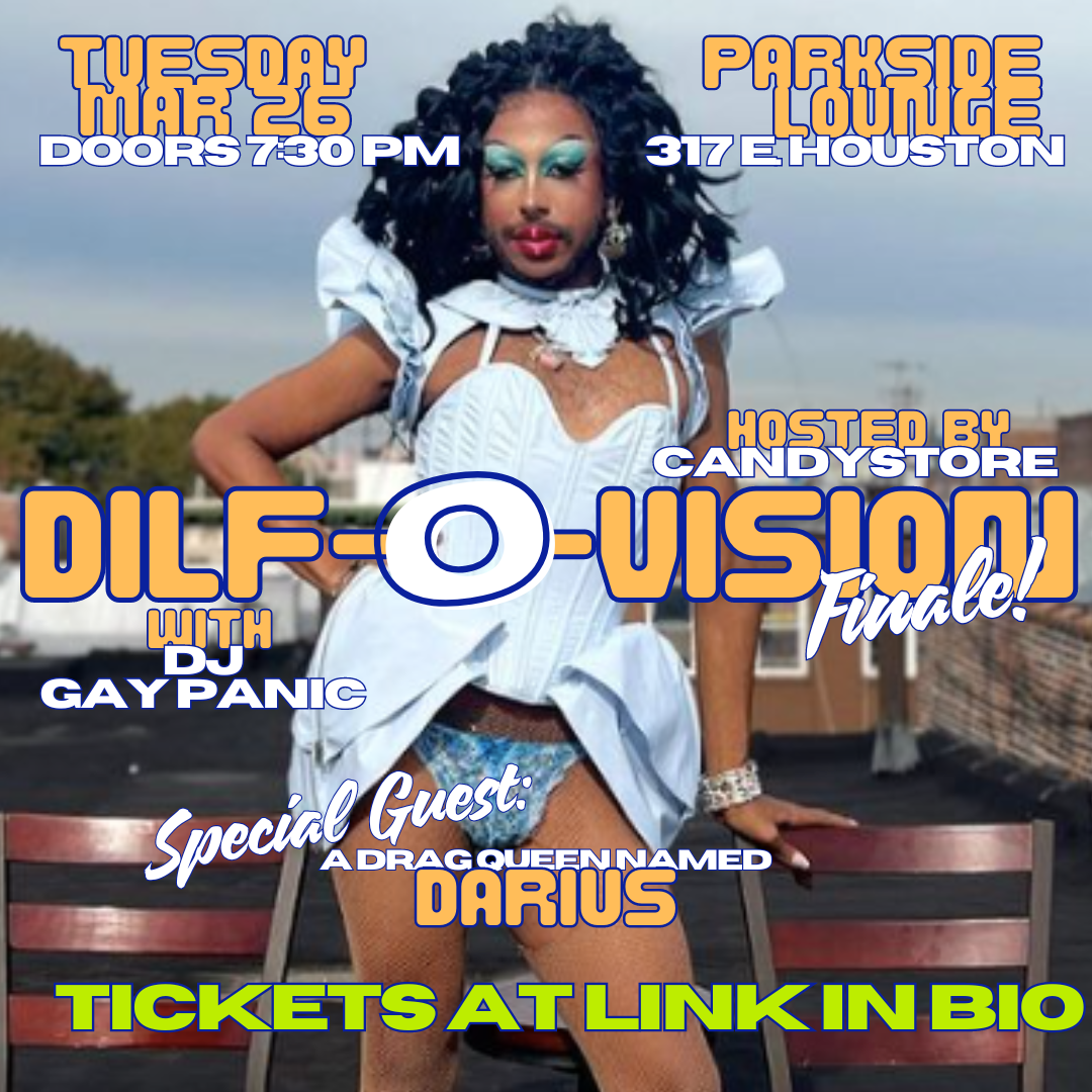 Join your hostess Candystore alongside DJ Gay Panic for DILF-o-Vision, a hilarious, weekly watch party of the reality show where men "in different stages of life" compete to find love (why does that sound so embarassing?).