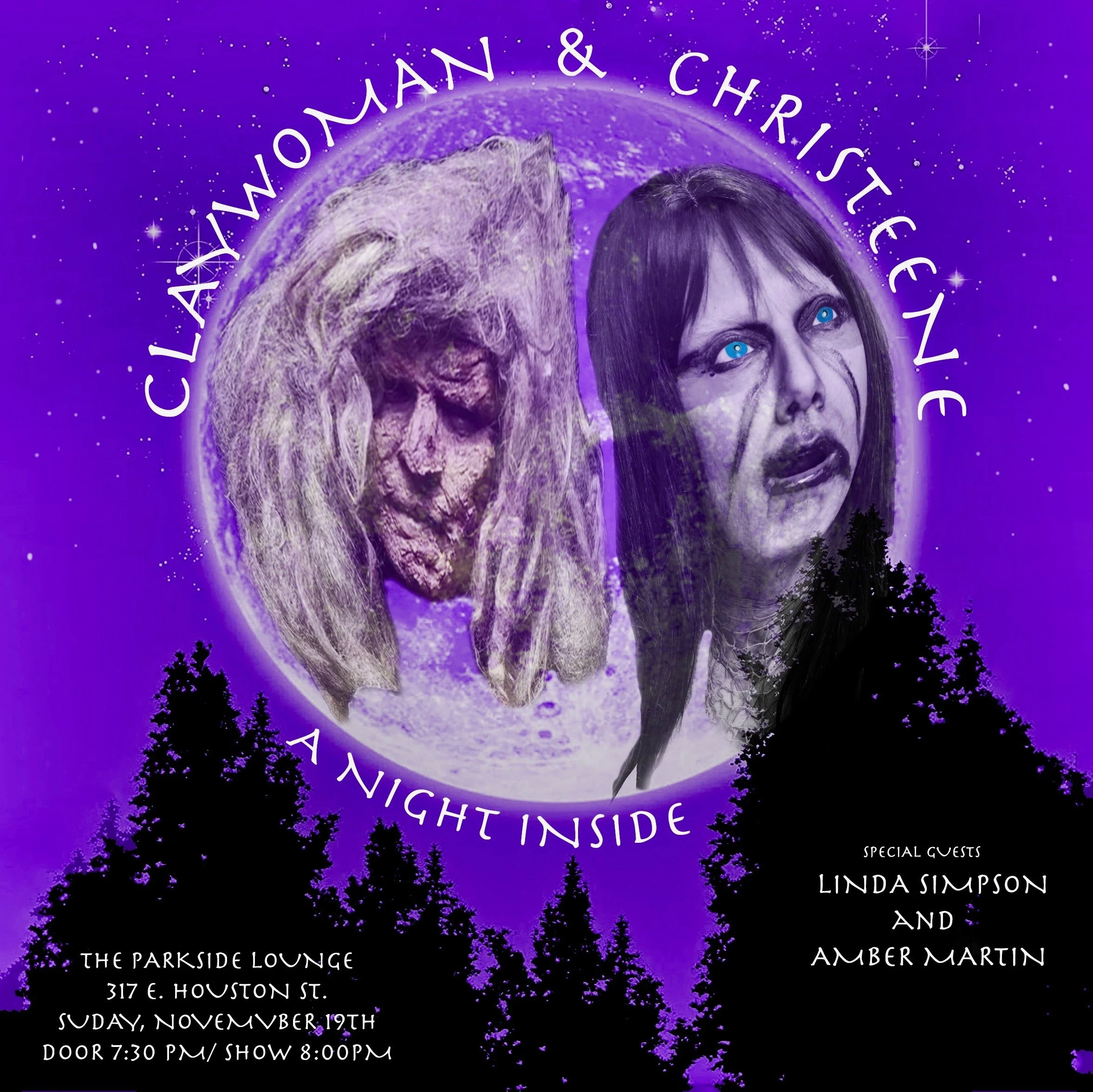 A most spectacular astral occasion will take place on Sunday November 19th at 7:30pm when CLAYWOMAN and CHRISTEENE once again reunite for A NIGHT INSIDE...an intimate evening of shared thoughts and artistic expressions. Like two oracles from opposite ends of the galaxy, they bring you their crusty pearls of wisdom and dusty volumes of experience along with two very special guests LINDA SIMPSON on the couch and AMBER MARTIN with the songs! Join them along with their stern sidekick, JUDITH, all at THE PARKSIDE LOUNGE as they explore new and uncharted realms together!