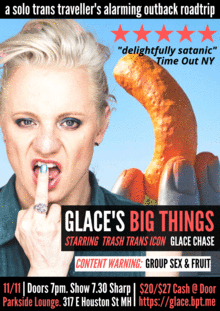 Stranded in Australia in 2020, hot-mess trans New Yorker Glace Chase hit the Outback on the hunt for Oz's cult iconic The Big Things. The Big Croc, The Big Meat-Ant, and The (many) Big Construction Worker Men in Hi-Visibility gear. This is an unhinged storytelling standup of a nightlife glamazon battling the Aussie outback & its inhabitants: danky dorm-rooms, roadside breakdowns, drug-fueled breakthroughs, man-meat, and finding all the Really Big Things.