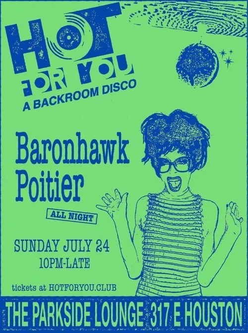 Hot For You is a monthly backroom disco for the family. Our favorite time of day is night. For July's installment we welcome the indomitable Baronhawk Poitier from Washington, D.C. to play all night. $10 in advance, $15 at the door. There are always tickets available at the door via cash or Venmo.