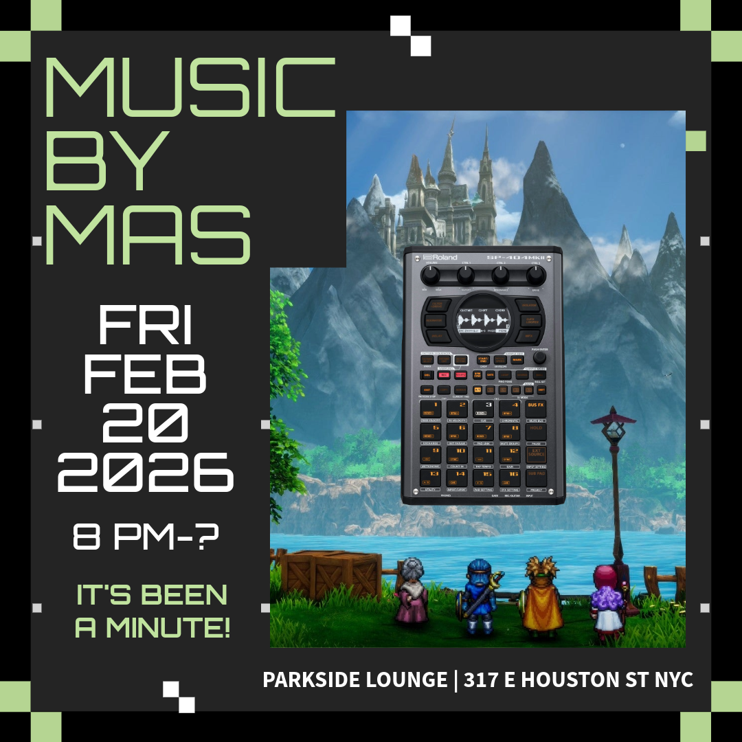 Back to All Events Music By Mas Friday, February 20, 2026 8:00 PM Saturday, February 21, 2026 1:00 AM Parkside Lounge 317 East Houston Street New York, NY, 10002 United States (map) Google Calendar ICS