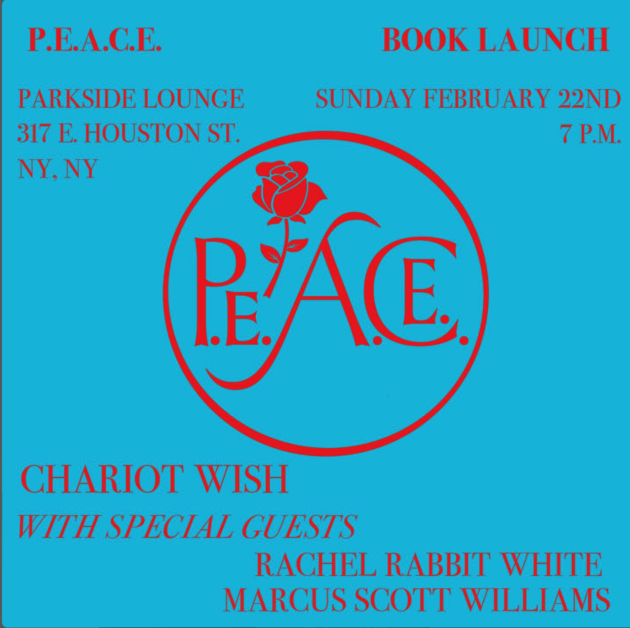 P.E.A.C.E. book launch by Chariot Wish Sunday, February 22, 2026 7:00 PM 10:00 PM Parkside Lounge 317 East Houston Street New York, NY, 10002 United States (map) Google Calendar ICS