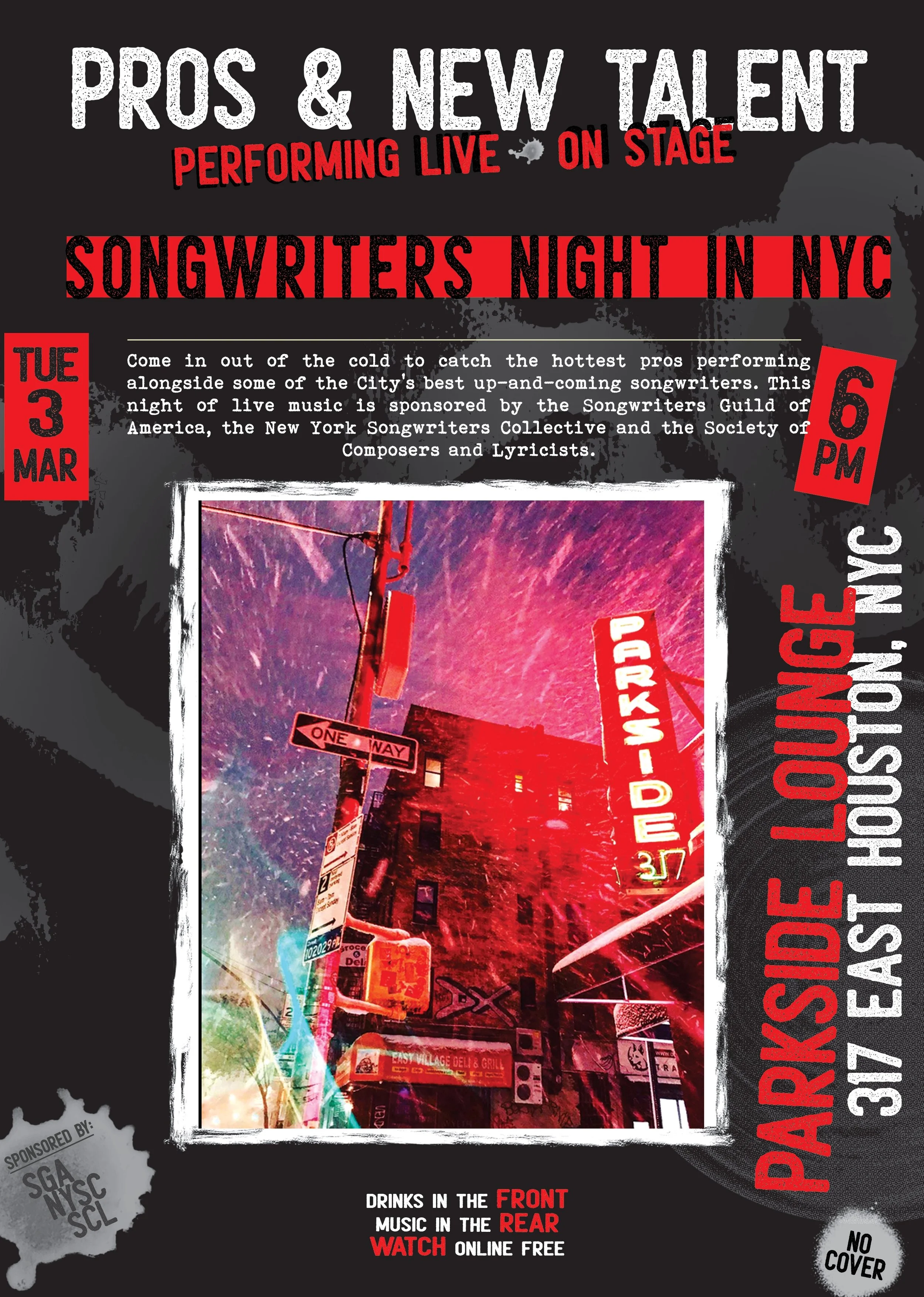Songwriters Night: Pros and New Talent Tuesday, March 3, 2026 6:00 PM 9:00 PM Parkside Lounge 317 East Houston Street New York, NY, 10002 United States (map) Google Calendar ICS