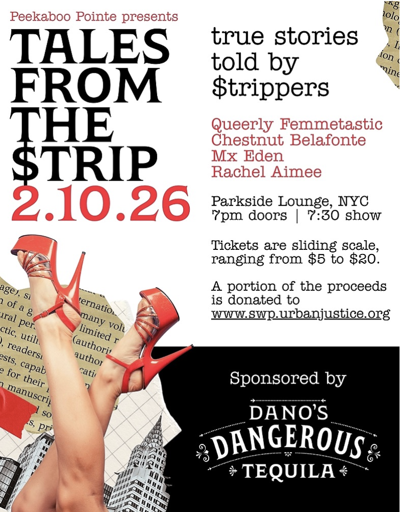 True stories told by $trippers! The wildest storytelling event in NYC! Come hear four current and former adult entertainment professionals tell their favorite moments from inside the club. www.ilovepeekaboopointe.com