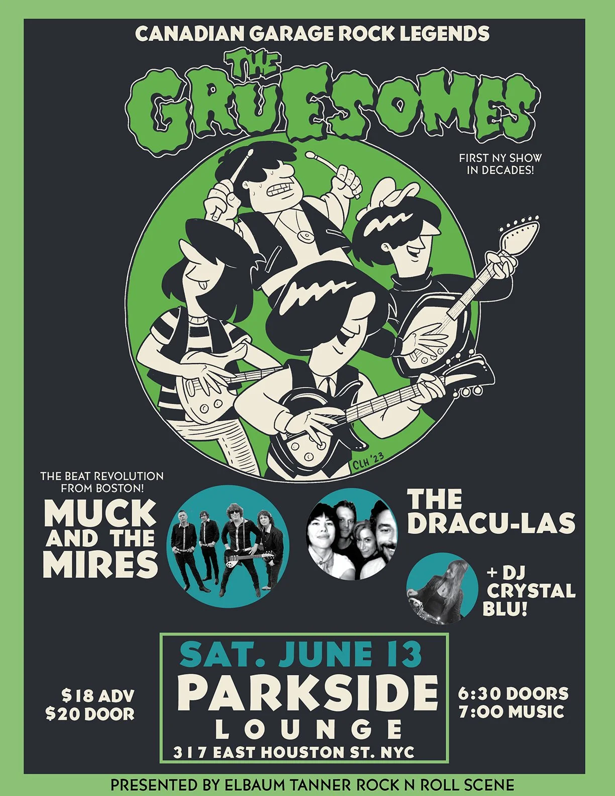 Formed in 1985, when members were between the ages of 16 and 19, Montreal’s legendary THE GRUESOMES have maintained the same lineup since 1987. Their debut album, Tyrants of Teen Trash (1986), became a cult hit, cementing their reputation as leaders of the 1960’s garage rock revival. This is their first NY show in decades! Boston’s veteran garage rockers MUCK AND THE MIRES were once described as “a mix of the 1964 Beatles and The Ramones” by legendary Runaways producer Kim Fowley (Fowley went on to produce several of the band’s records). The group achieved worldwide recognition after they were crowned #1 US Garage Rock Band by LITTLE STEVEN Van Zandt in his battle of the bands on MTV. The Dracu-Las from NJ open offering girl group inspired surfy garage punk for the beach goth set. DJ Crystal Blu spins from here amazing collection of garage and underground rock.
