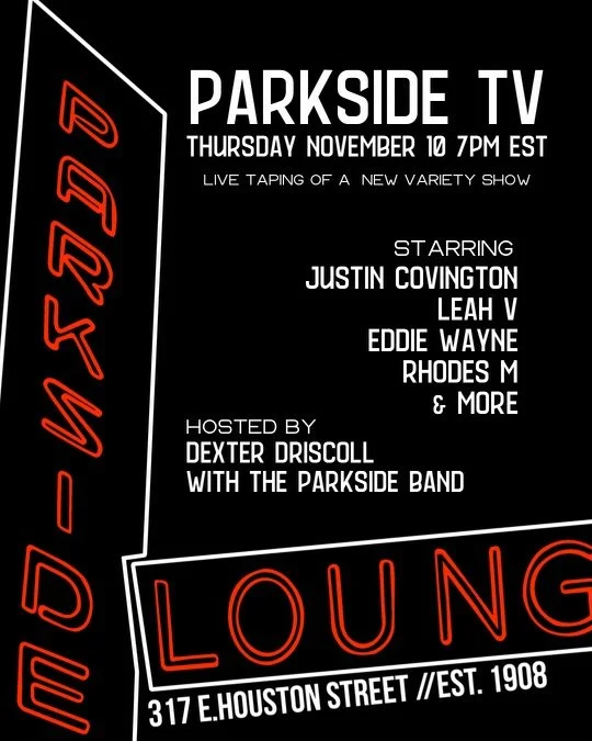 Elated to invite you to the first taping of the upcoming Parkside TV variety show this coming Thursday November 10 at 7pm. Free!
