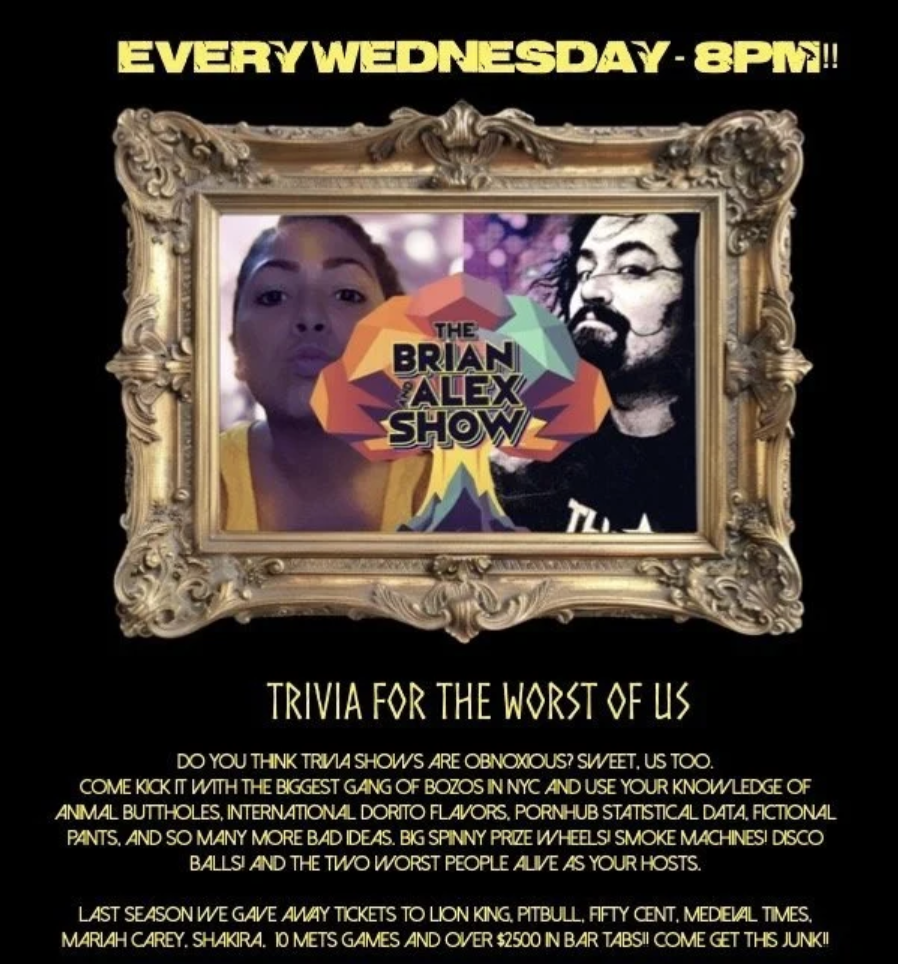 The brian and alex trivia show Wednesday, April 1, 2026 7:30 PM 8:30 PM Parkside Lounge 317 East Houston Street New York, NY, 10002 United States (map) Google Calendar ICS